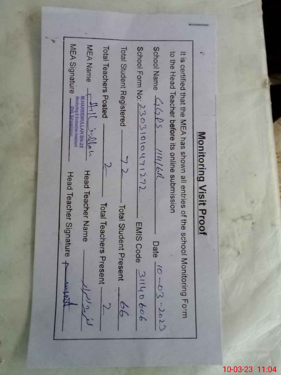| Attendance Register | Head Teacher | MEA with School | Visit Proof |
