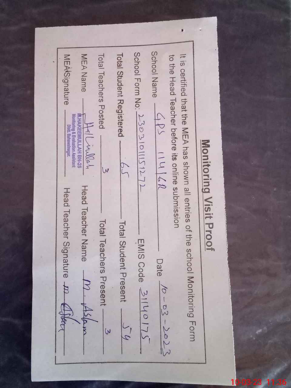 | EMIS Code: 31140175 | Name of School: GPS CHAK NO 114/6-R | |||