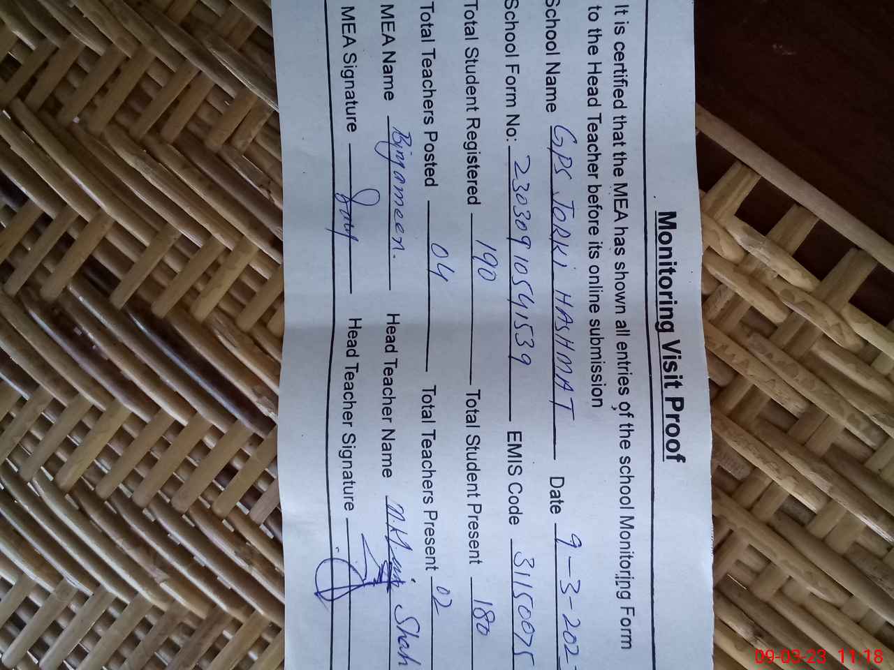 | EMIS Code: 31150075 | Name of School: GPS JORKI HASHMAT | |||