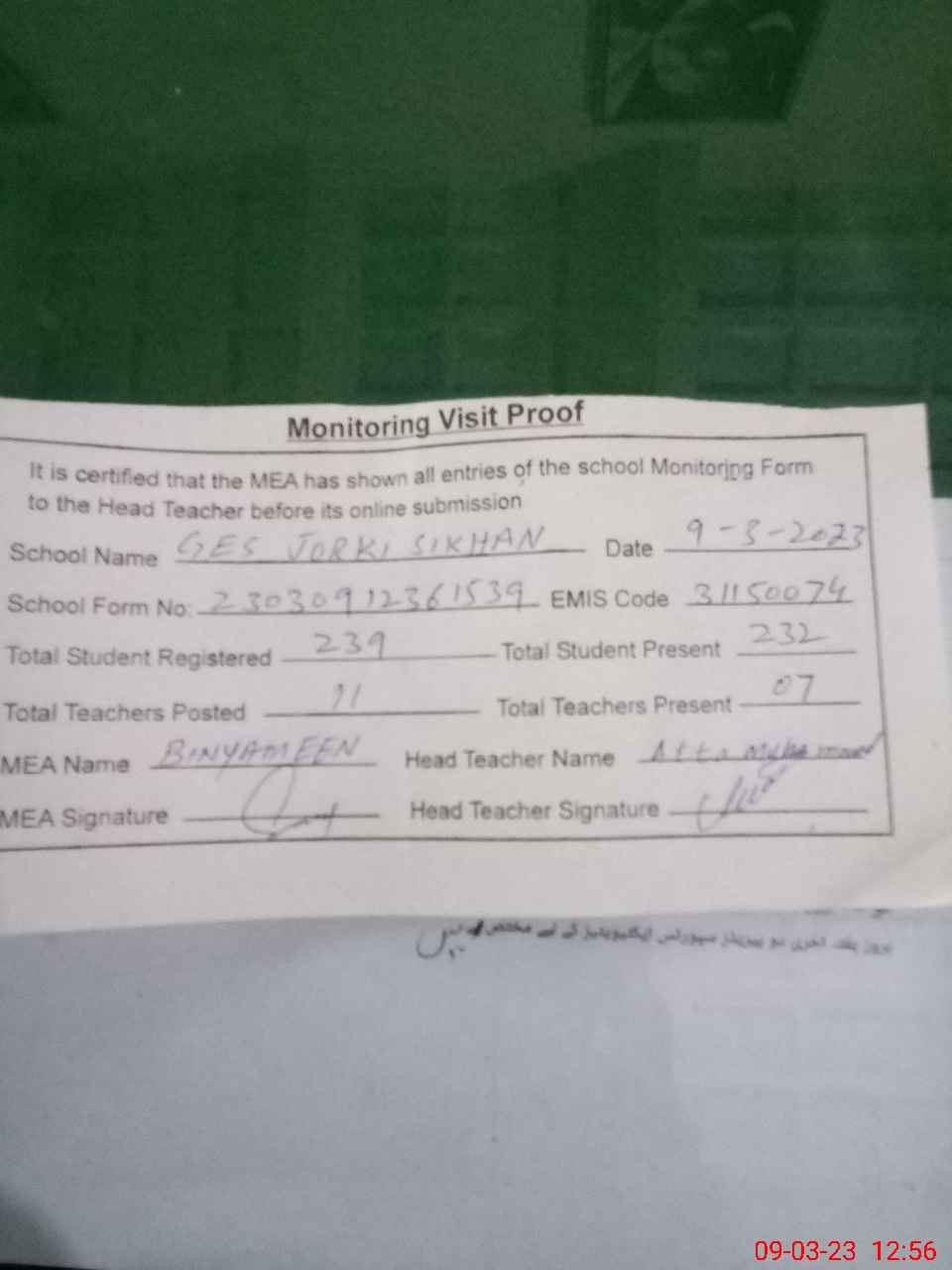 | Attendance Register | Head Teacher | MEA with School | Visit Proof |