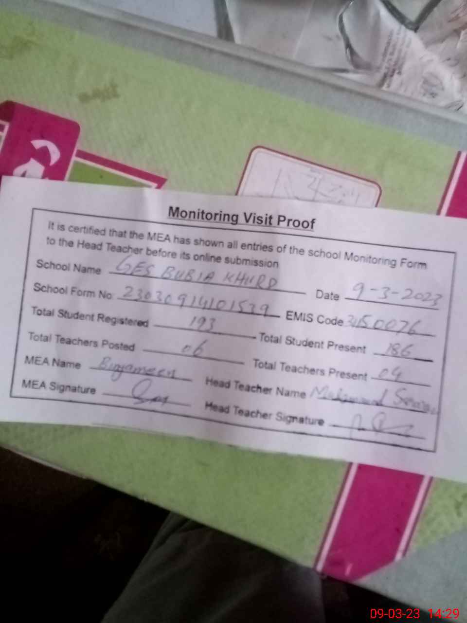 | Attendance Register | Head Teacher | MEA with School | Visit Proof |