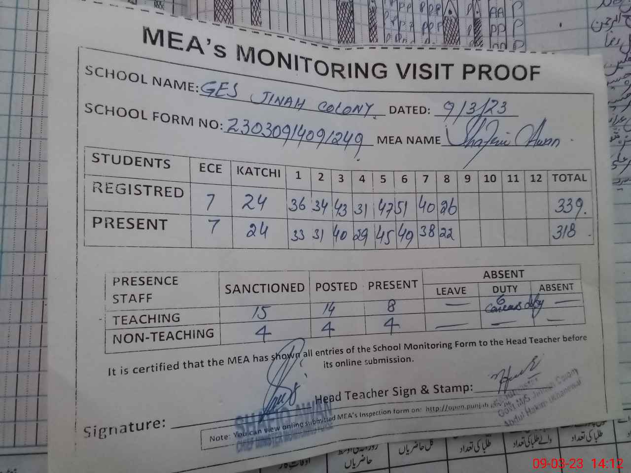 | Attendance Register | Head Teacher | MEA with School | Visit Proof |