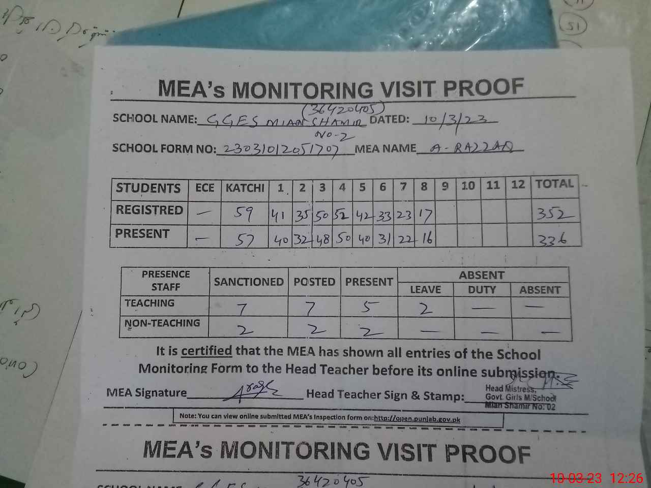 | Attendance Register | Head Teacher | MEA with School | Visit Proof |