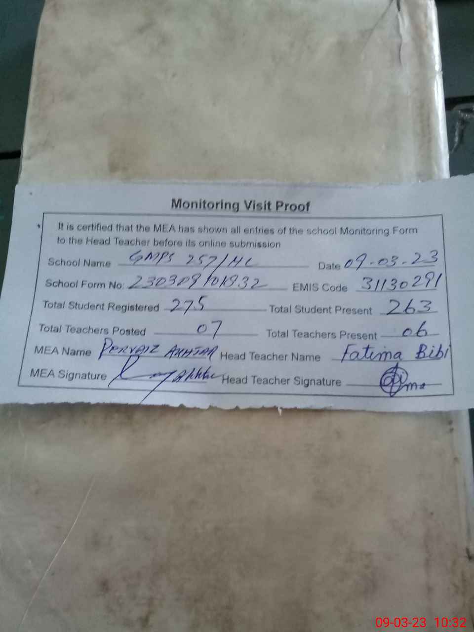 | Attendance Register | Head Teacher | MEA with School | Visit Proof |