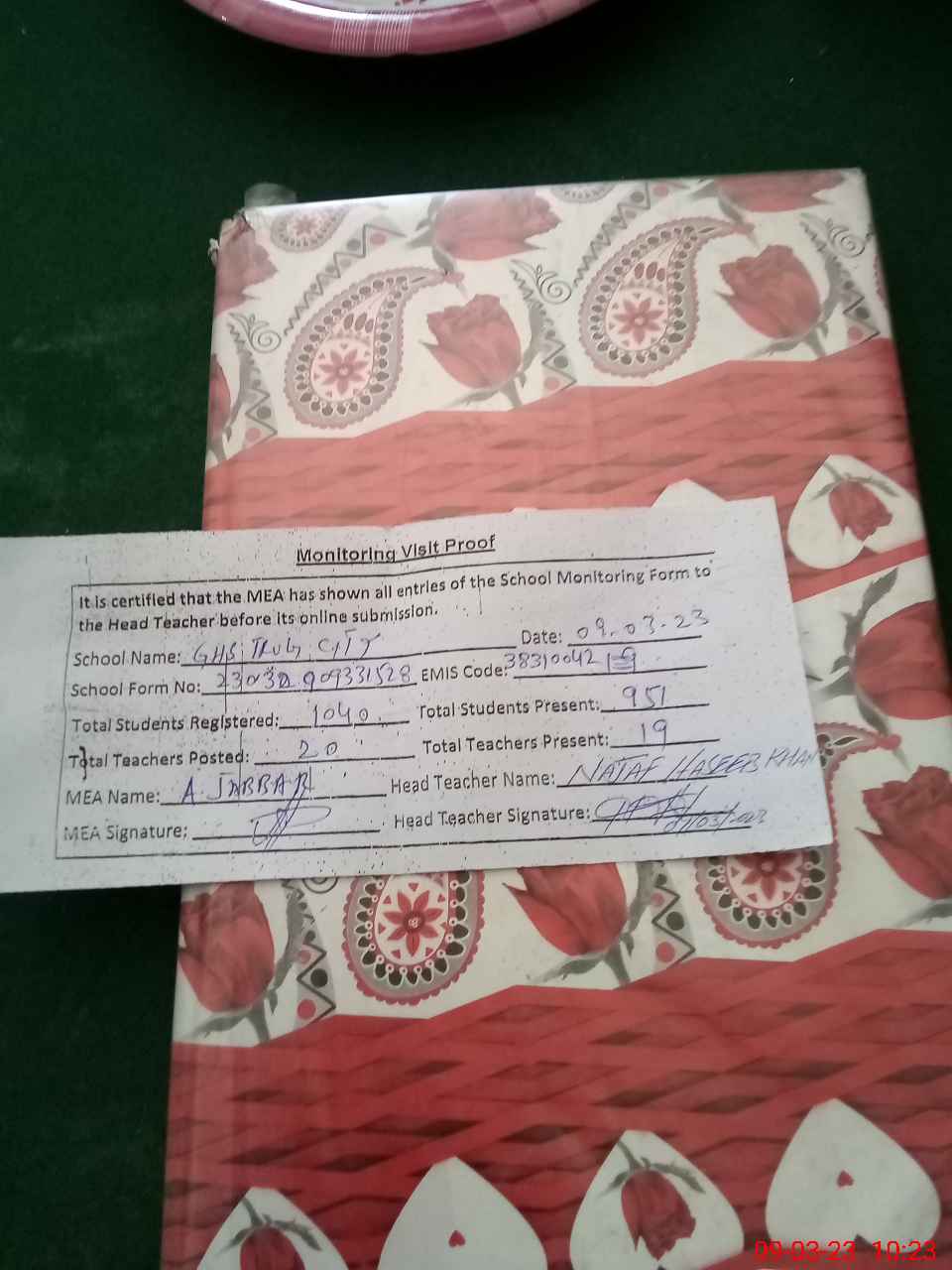 | Attendance Register | Head Teacher | MEA with School | Visit Proof |