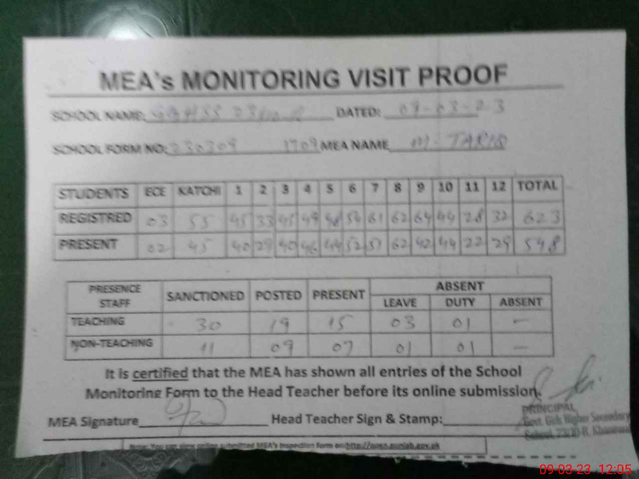 | Attendance Register | Head Teacher | MEA with School | Visit Proof |
