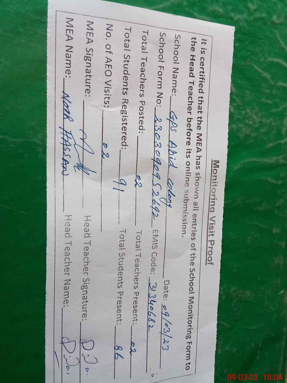 | Attendance Register | Head Teacher | MEA with School | Visit Proof |