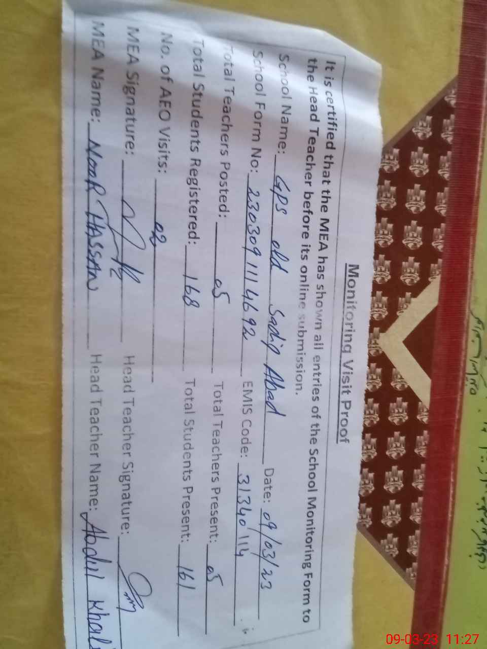 | Attendance Register | Head Teacher | MEA with School | Visit Proof |