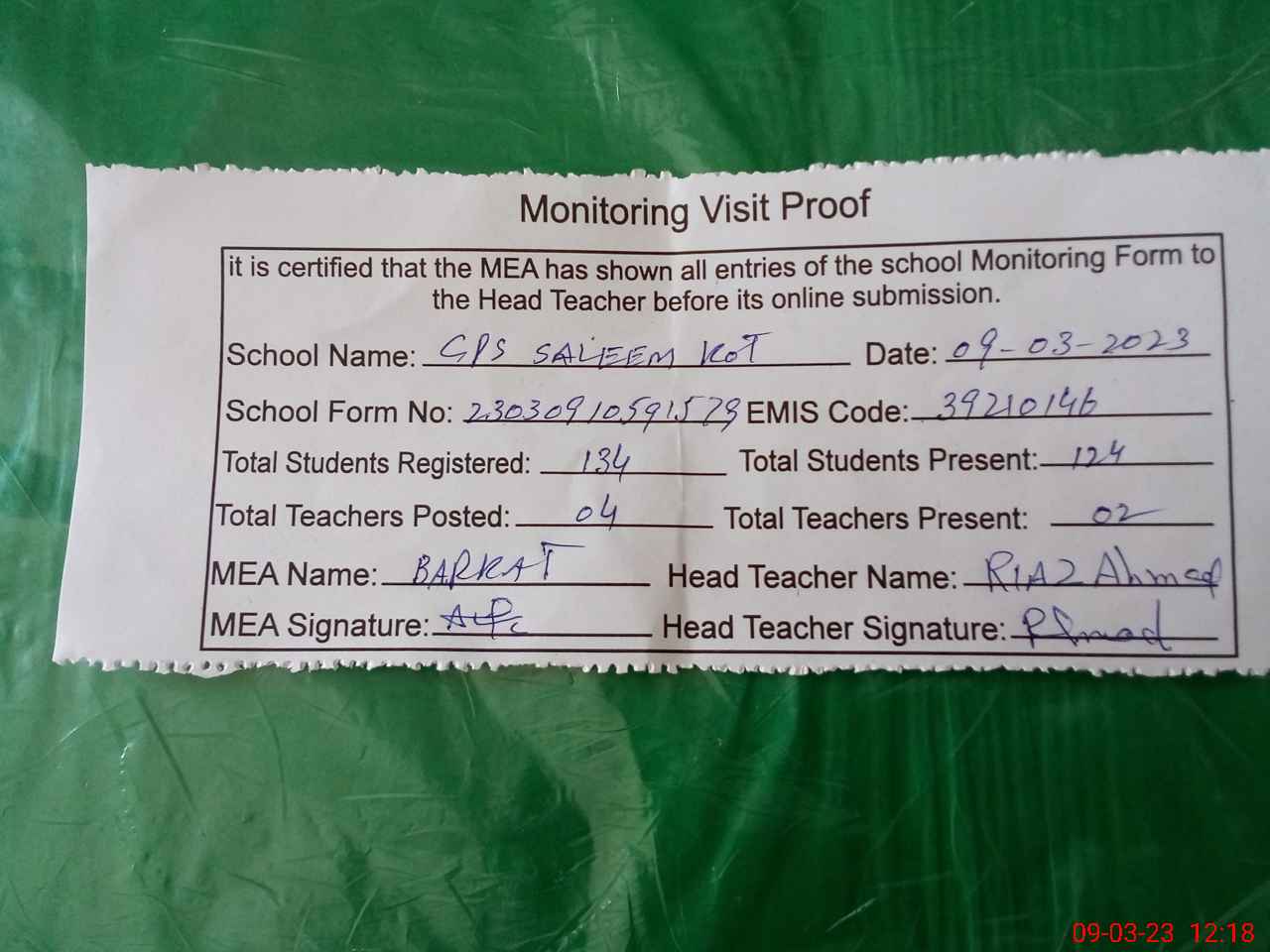 | Attendance Register | Head Teacher | MEA with School | Visit Proof |