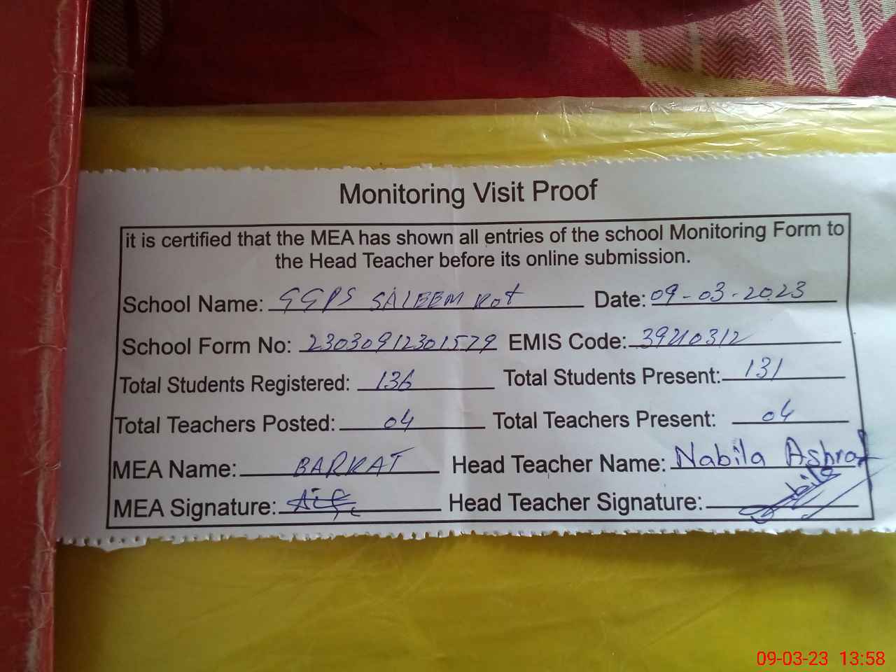 | Attendance Register | Head Teacher | MEA with School | Visit Proof |