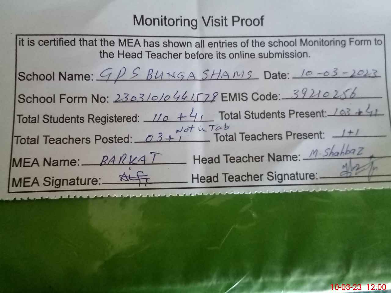 | EMIS Code: 39210256 | Name of School: GPS BUNGA SHAMS | |||
