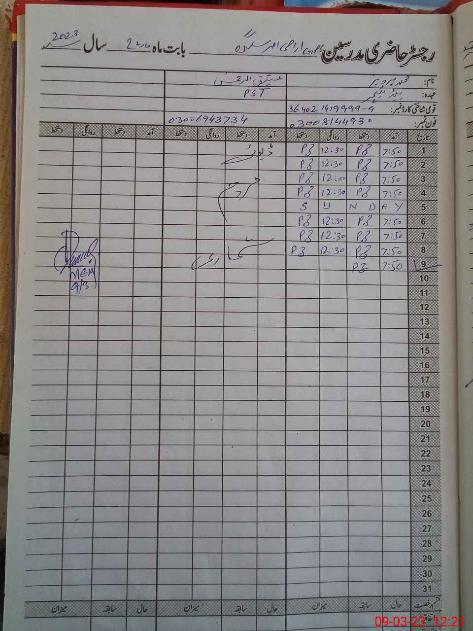 | Name: At**** URe**** Designation: (School Headmaster's/Headmistress's) PTC Phone/Cell Number: 03**** |