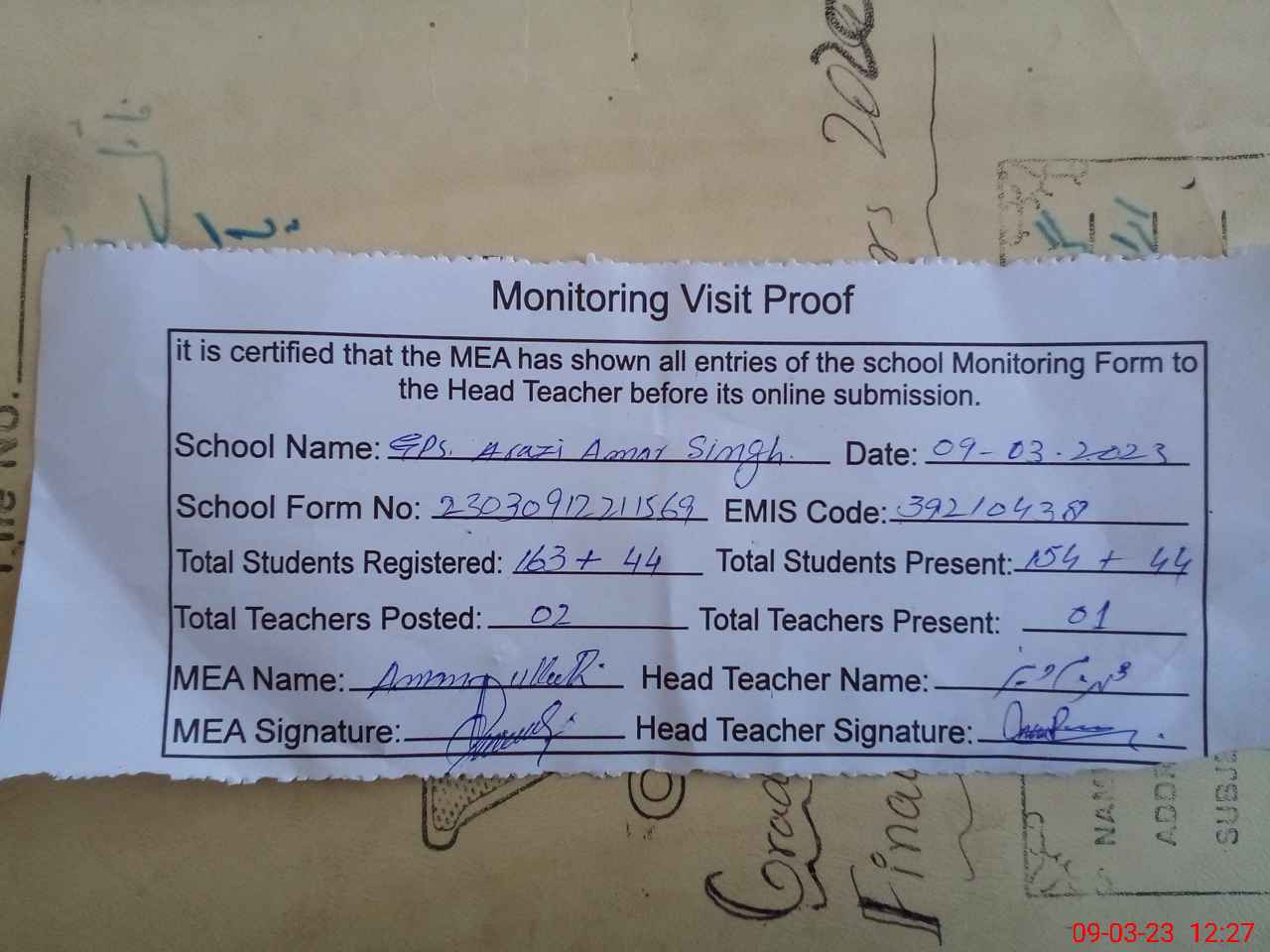 | Attendance Register | Head Teacher | MEA with School | Visit Proof |