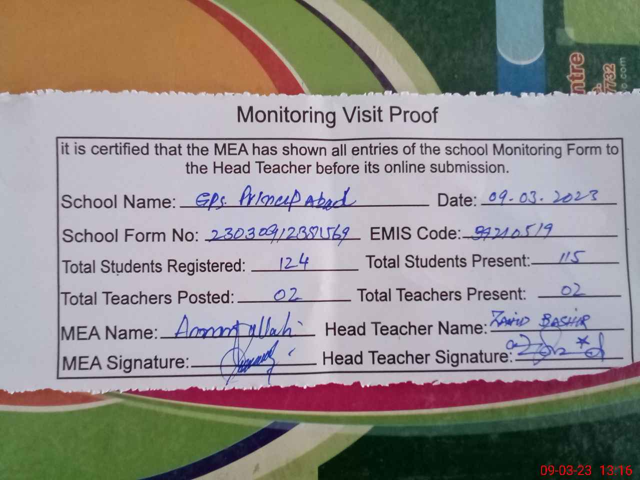 | Attendance Register | Head Teacher | MEA with School | Visit Proof |