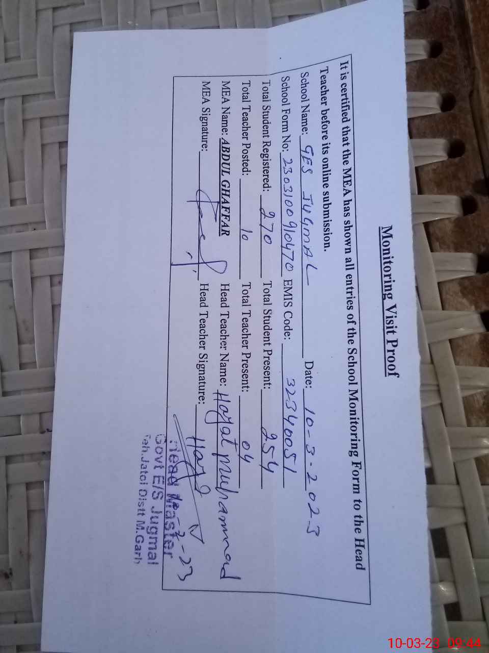 | Certified that this School was Inspected by the Undersigned MEA/DMO Today and the Information Stated Above is as Per Record. | |||||