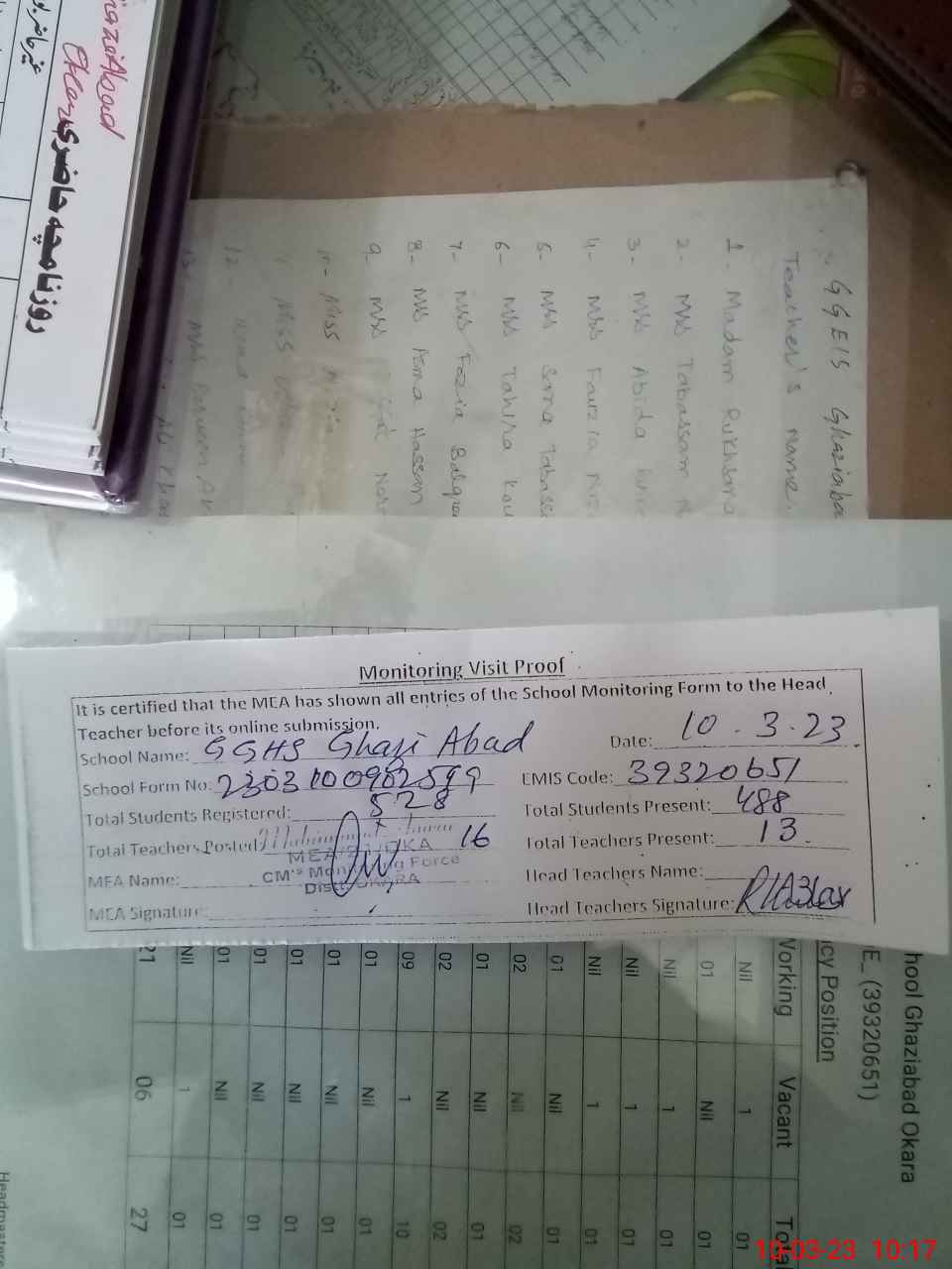 | Attendance Register | Head Teacher | MEA with School | Visit Proof |