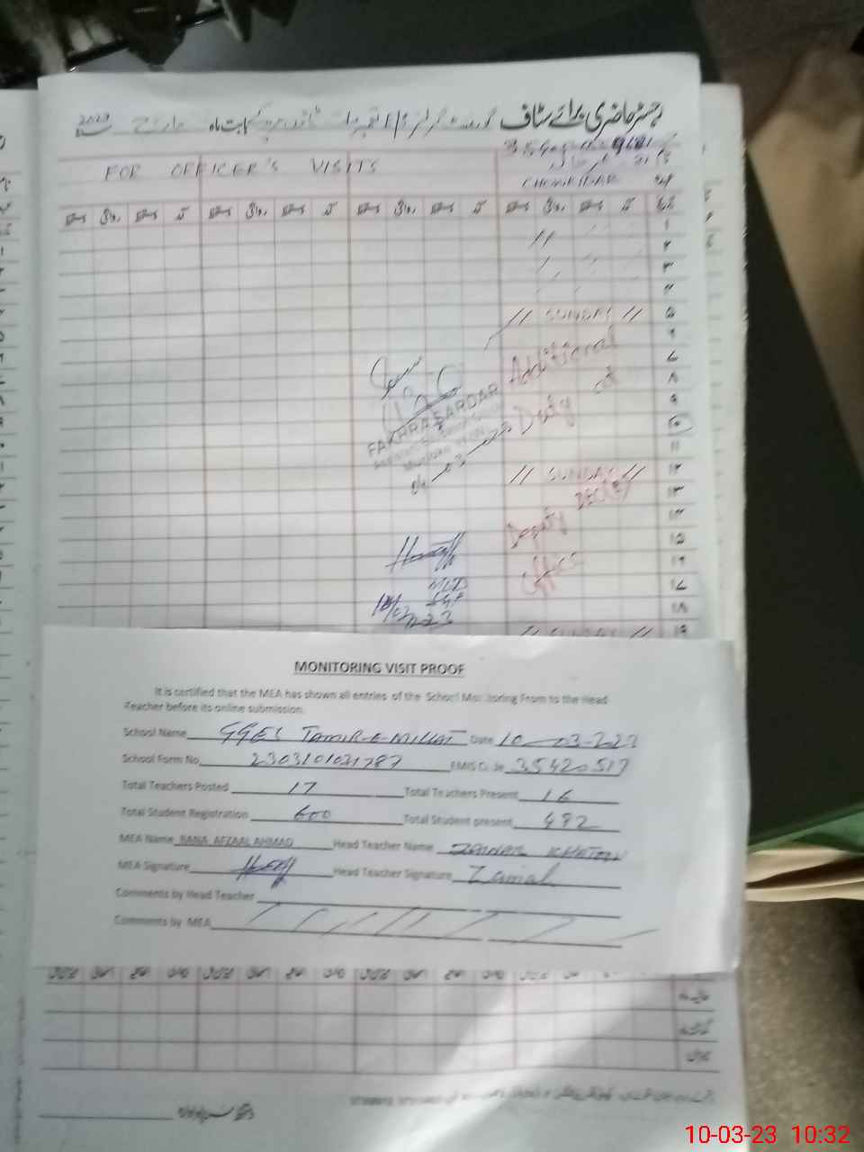 | Attendance Register | Head Teacher | MEA with School | Visit Proof |