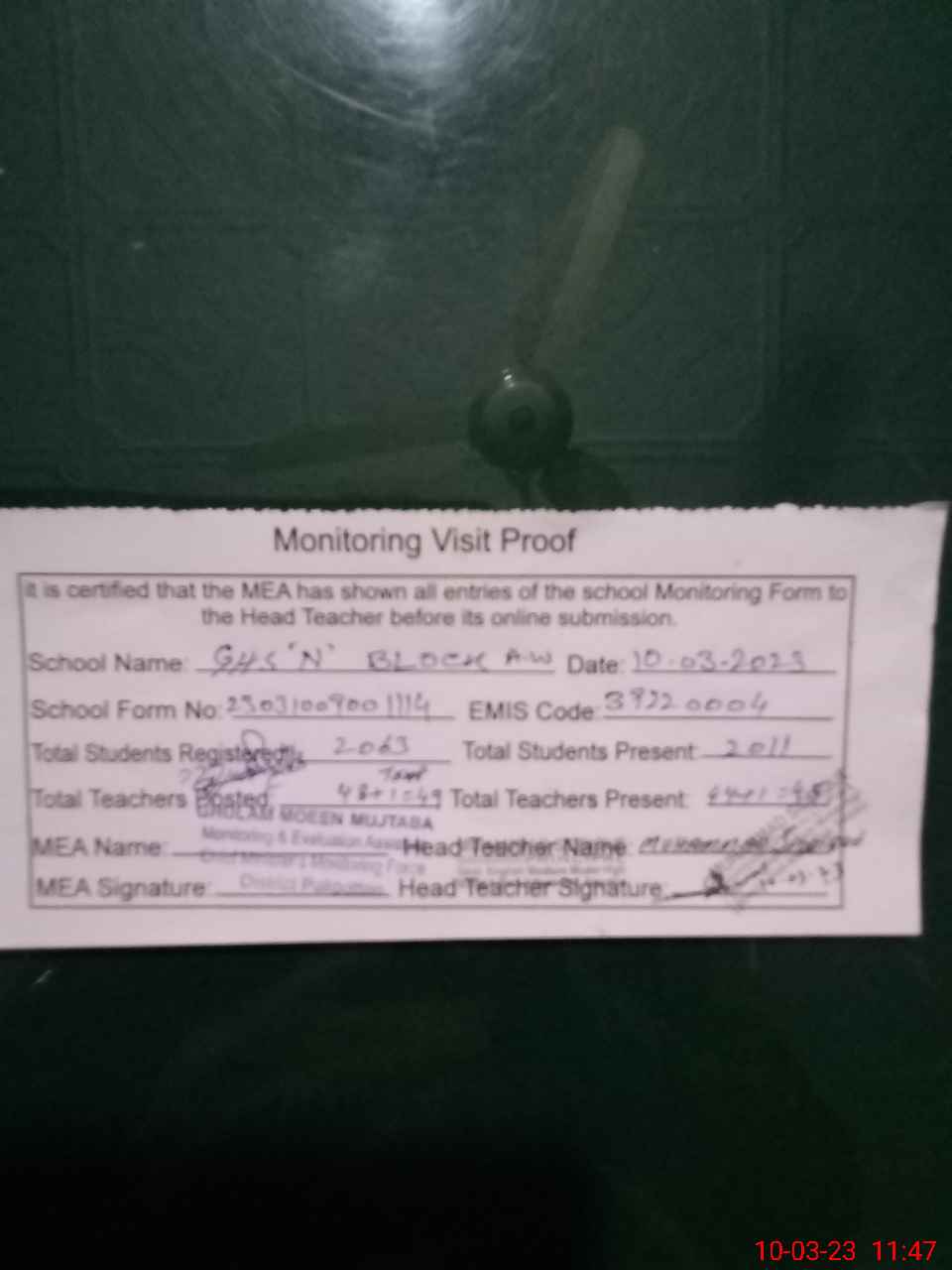 | Certified that this School was Inspected by the Undersigned MEA/DMO Today and the Information Stated Above is as Per Record. | |||||