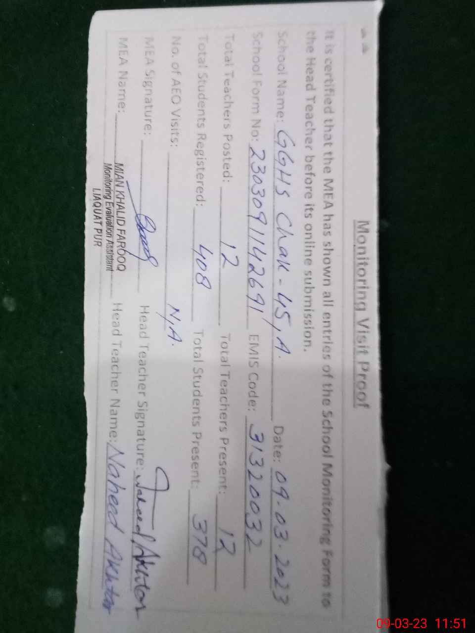 | Attendance Register | Head Teacher | MEA with School | Visit Proof |
