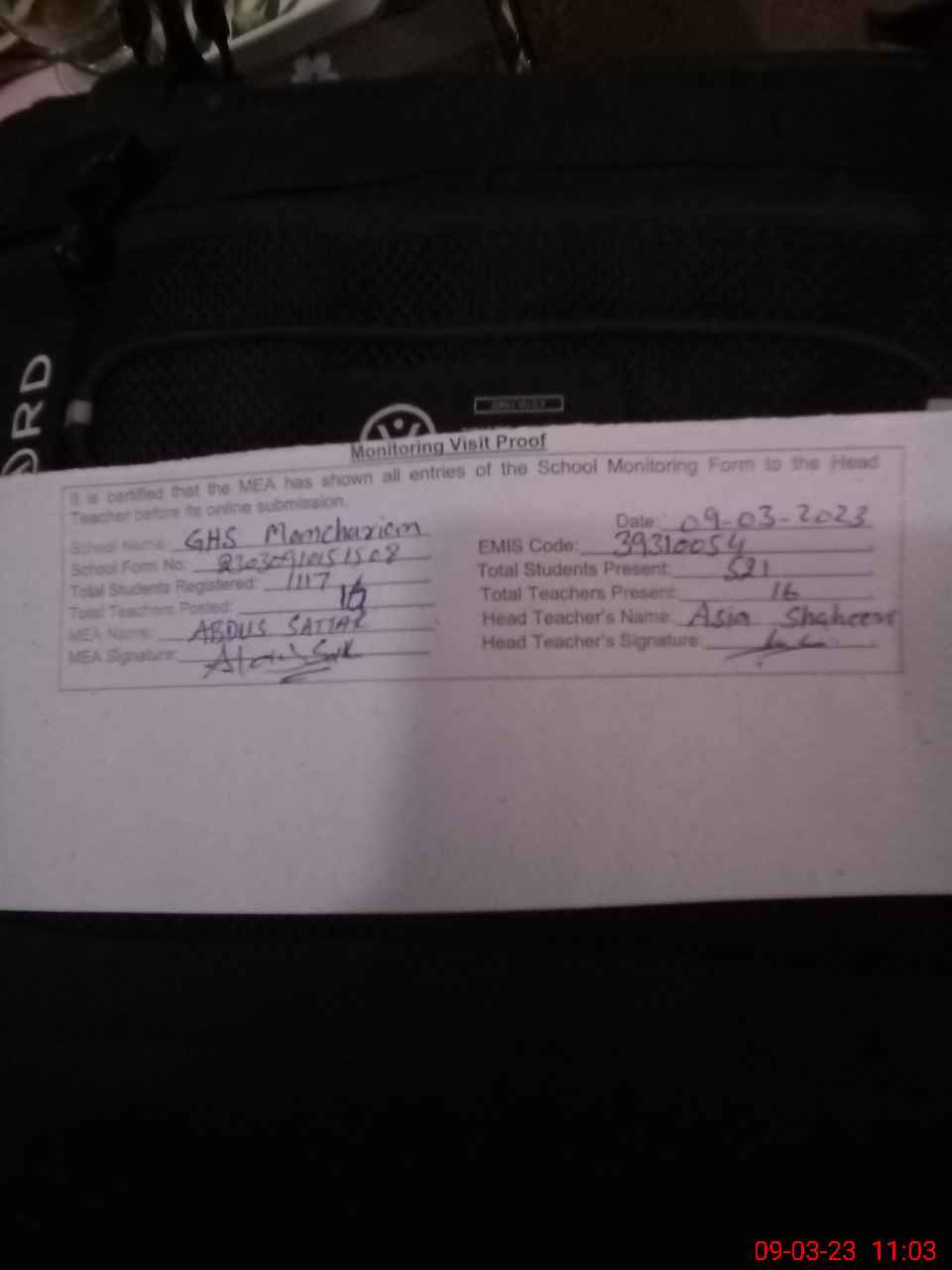 | Attendance Register | Head Teacher | MEA with School | Visit Proof |