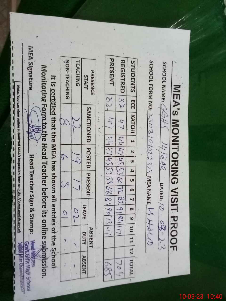 | Attendance Register | Head Teacher | MEA with School | Visit Proof |