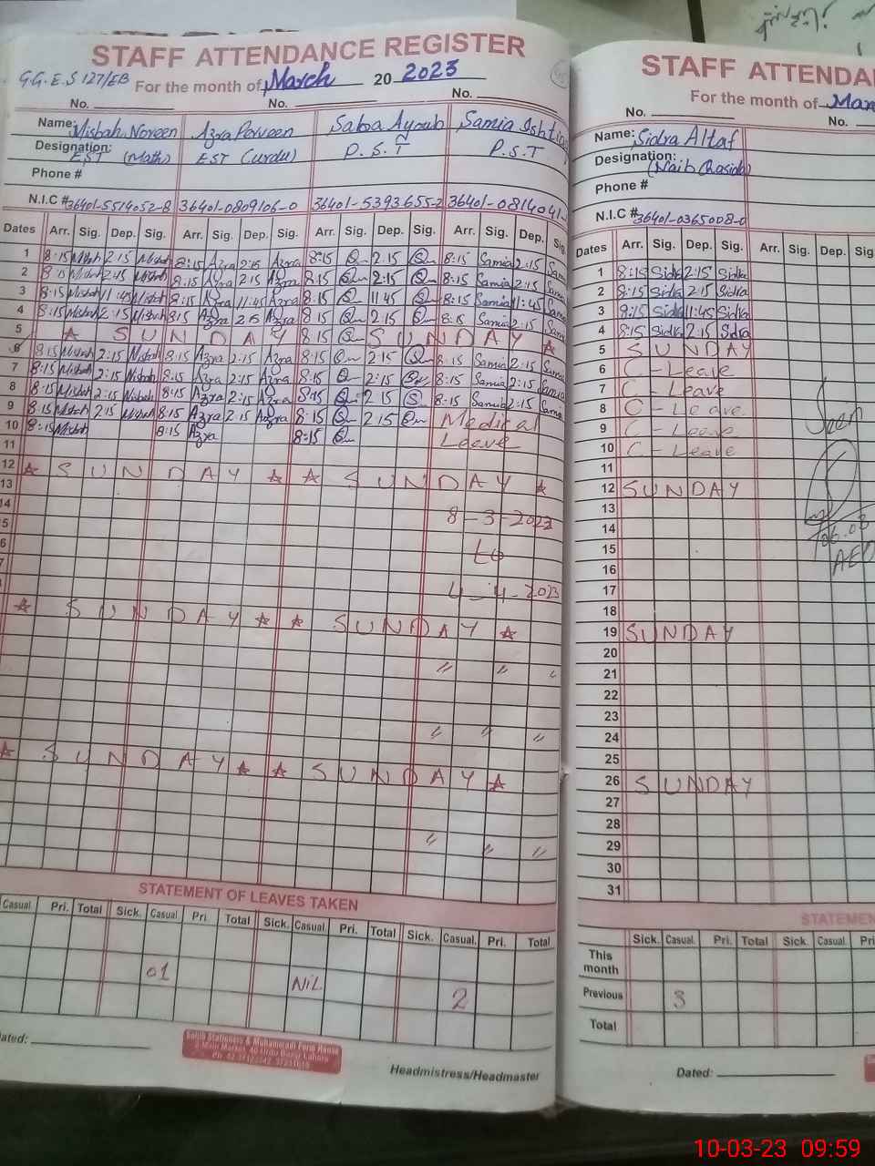 | CNIC | Full Name | Designation | R/C | Absence During Last Calender Month |