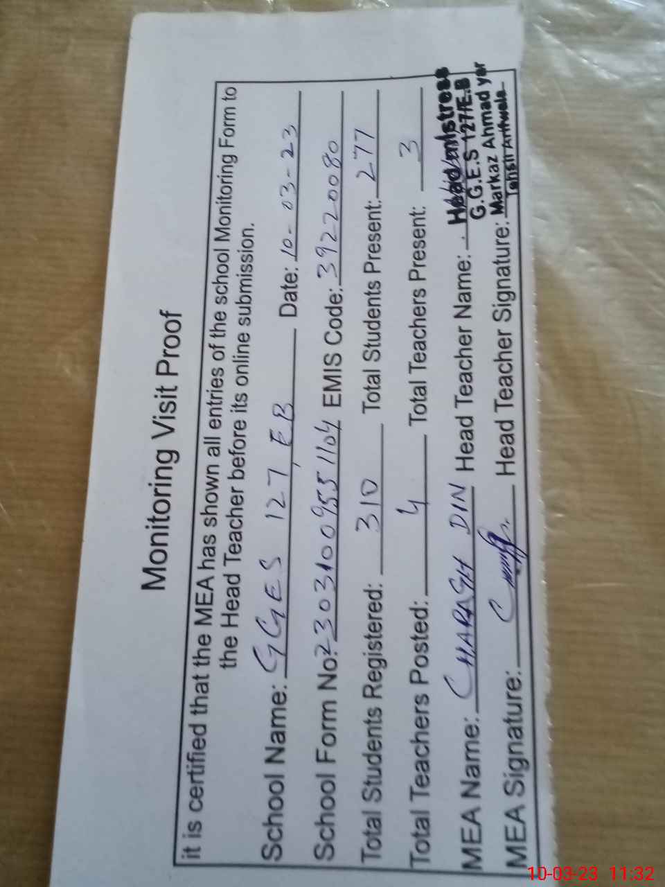 | Attendance Register | Head Teacher | MEA with School | Visit Proof |