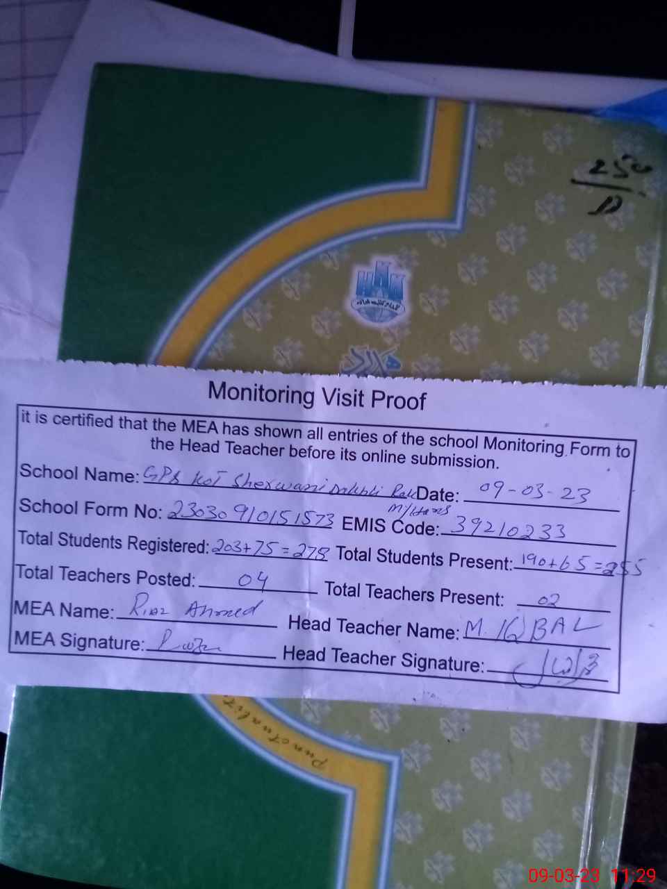 | Attendance Register | Head Teacher | MEA with School | Visit Proof |