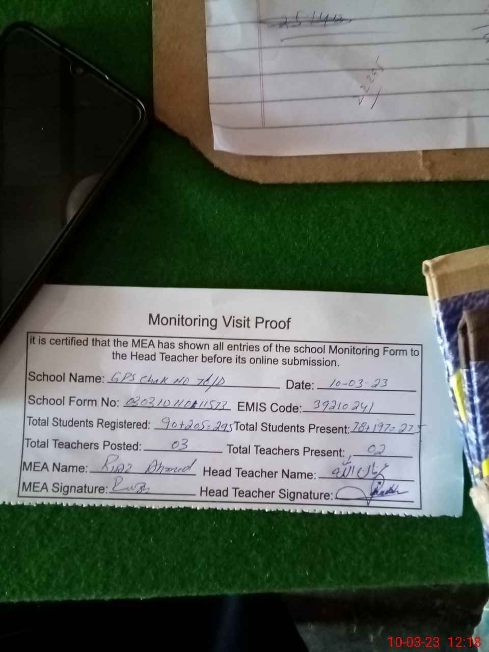 | Attendance Register | Head Teacher | MEA with School | Visit Proof |