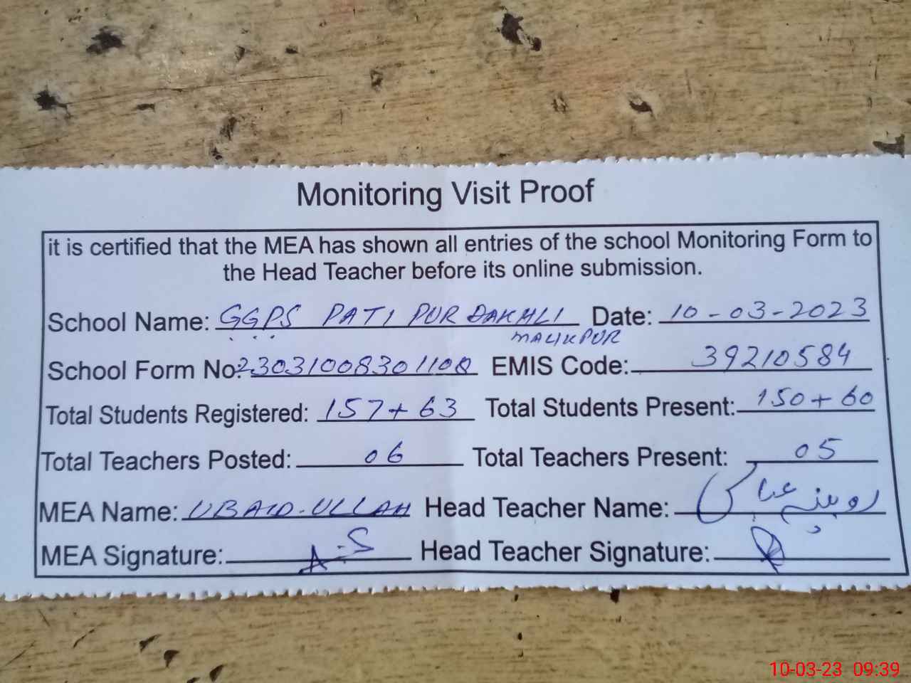 | Attendance Register | Head Teacher | MEA with School | Visit Proof |