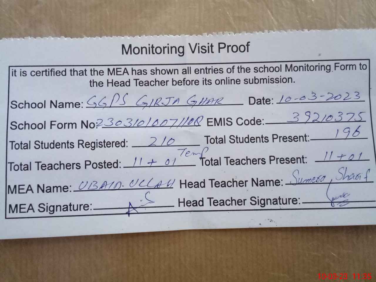 | Attendance Register | Head Teacher | MEA with School | Visit Proof |
