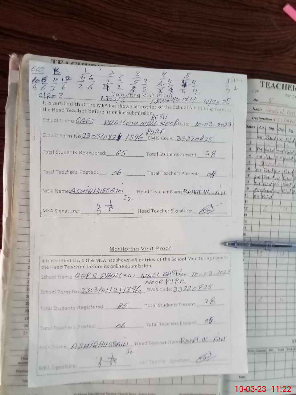 | Attendance Register | Head Teacher | MEA with School | Visit Proof |