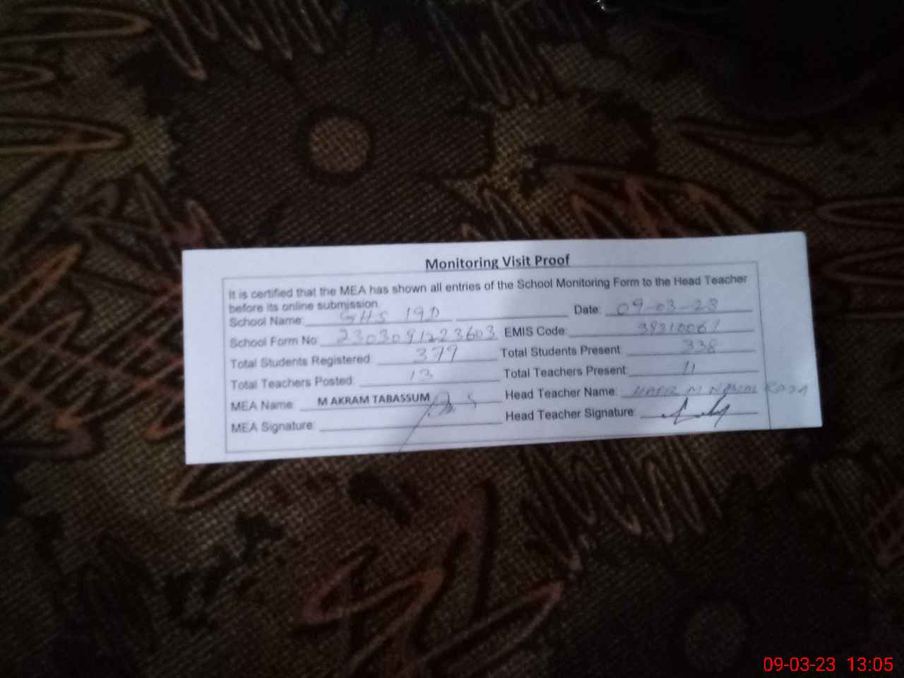 | Attendance Register | Head Teacher | MEA with School | Visit Proof |