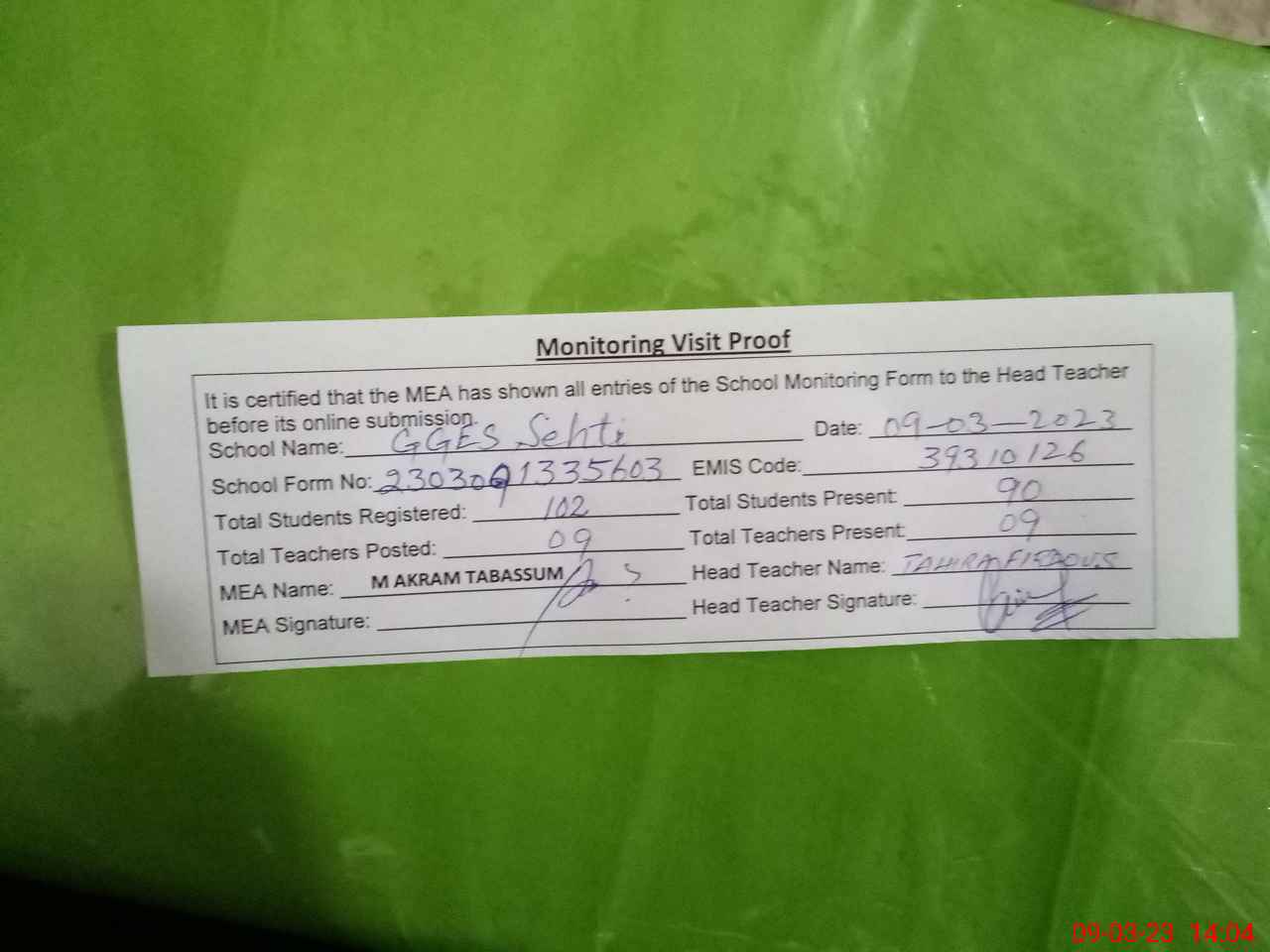 | Attendance Register | Head Teacher | MEA with School | Visit Proof |
