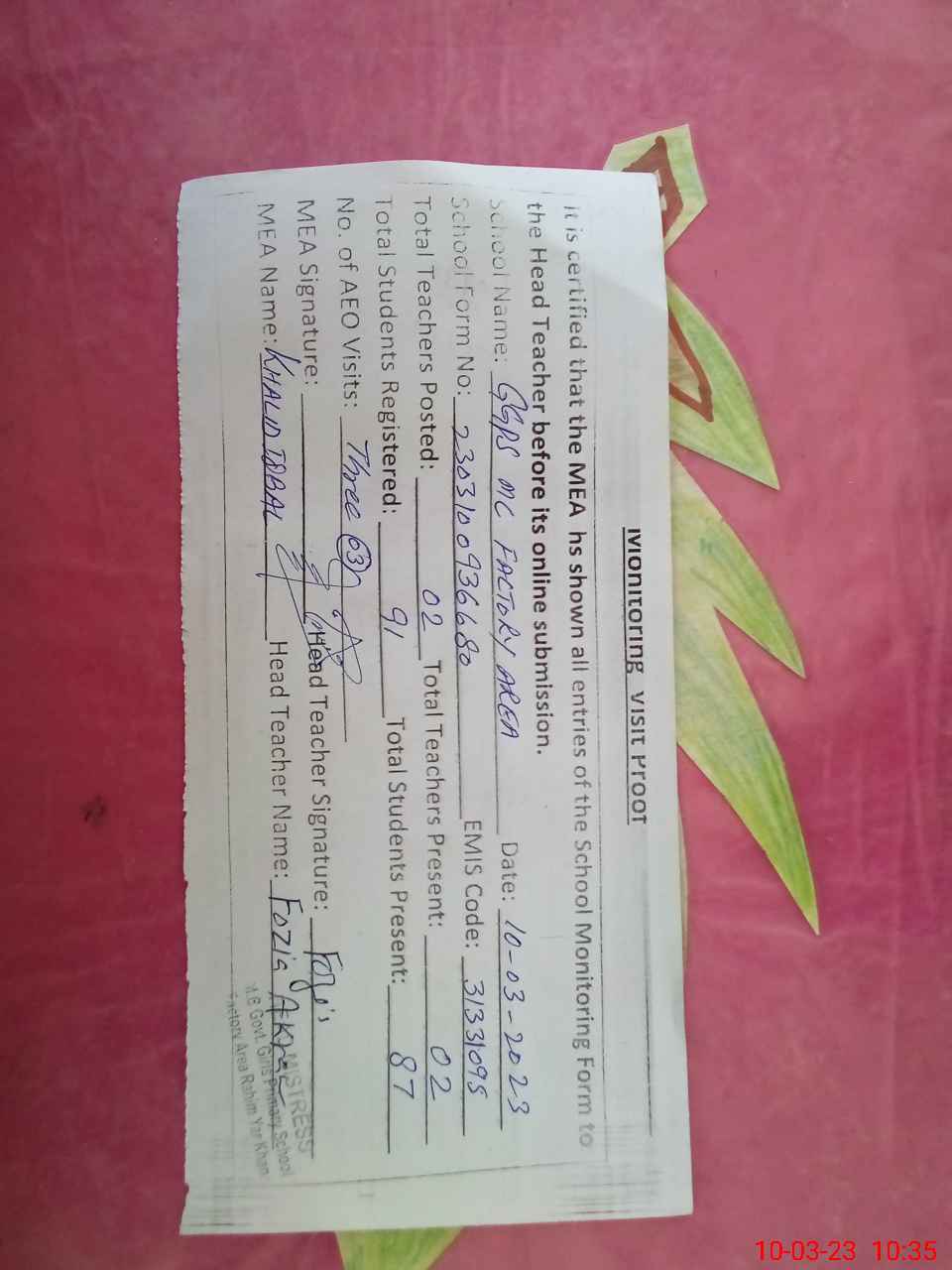 | Remarks (Use Separate Page if Required): Class verification is not updated on mea tab as per sis and four classes are sitting under shed and roofs of all class rooms are dangerous TRs are crruoded | |||||