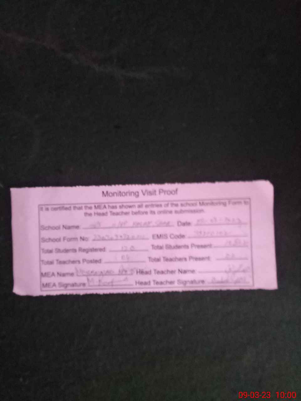 | Attendance Register | Head Teacher | MEA with School | Visit Proof |
