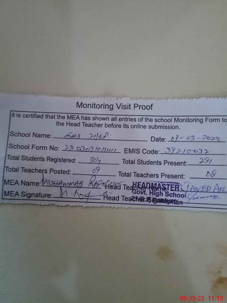 | EMIS Code: 39210032 | Name of School: GHS CHAK NO. 21/SP | |||