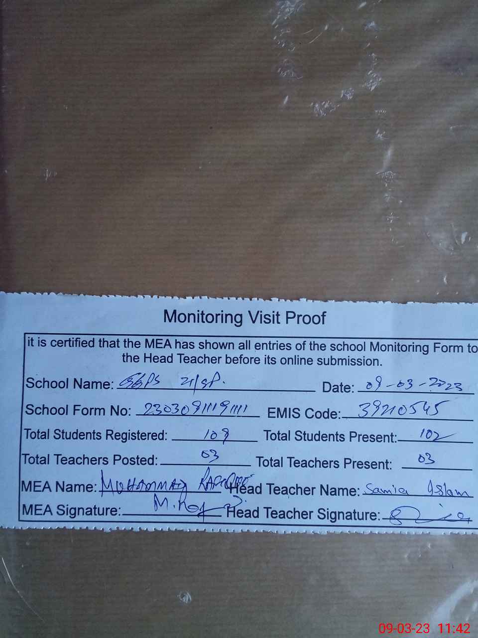 | Attendance Register | Head Teacher | MEA with School | Visit Proof |