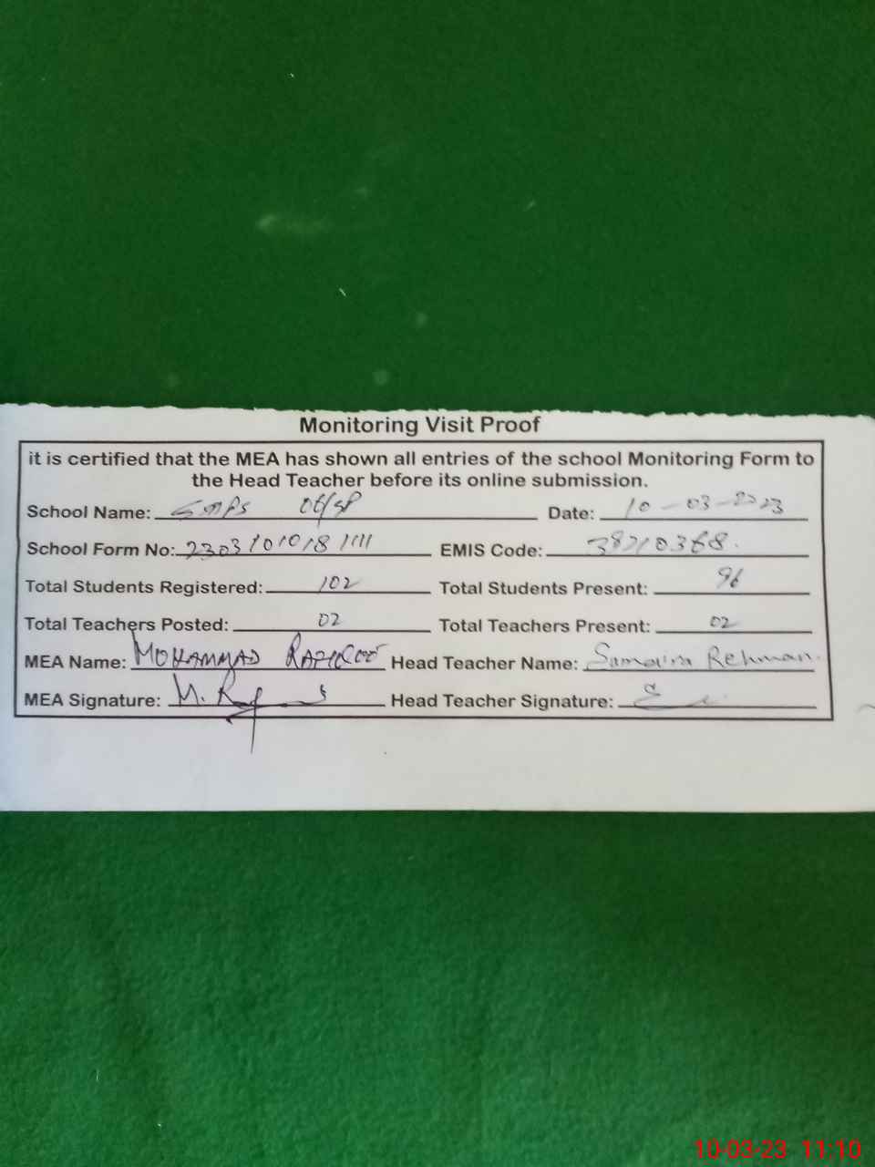 | Monitoring Date: 10-03-2023 | Start Time: 10-03-2023 10:18 AM | End Time: 10-03-2023 11:11 AM | Name of MEA: Mu**** Ra**** | |