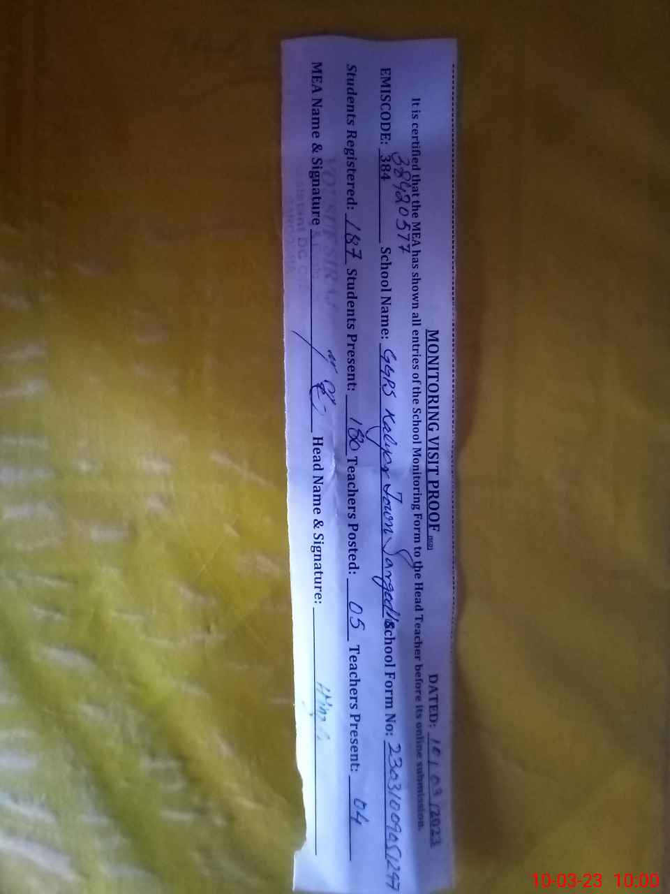 | Monitoring Date: 10-03-2023 | Start Time: 10-03-2023 09:05 AM | End Time: 10-03-2023 10:18 AM | Name of MEA: YO**** SI**** | |