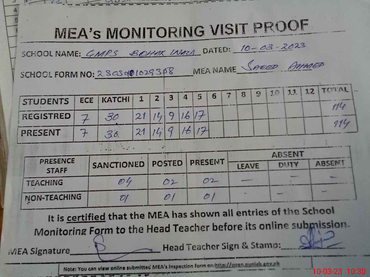 | Attendance Register | Head Teacher | MEA with School | Visit Proof |