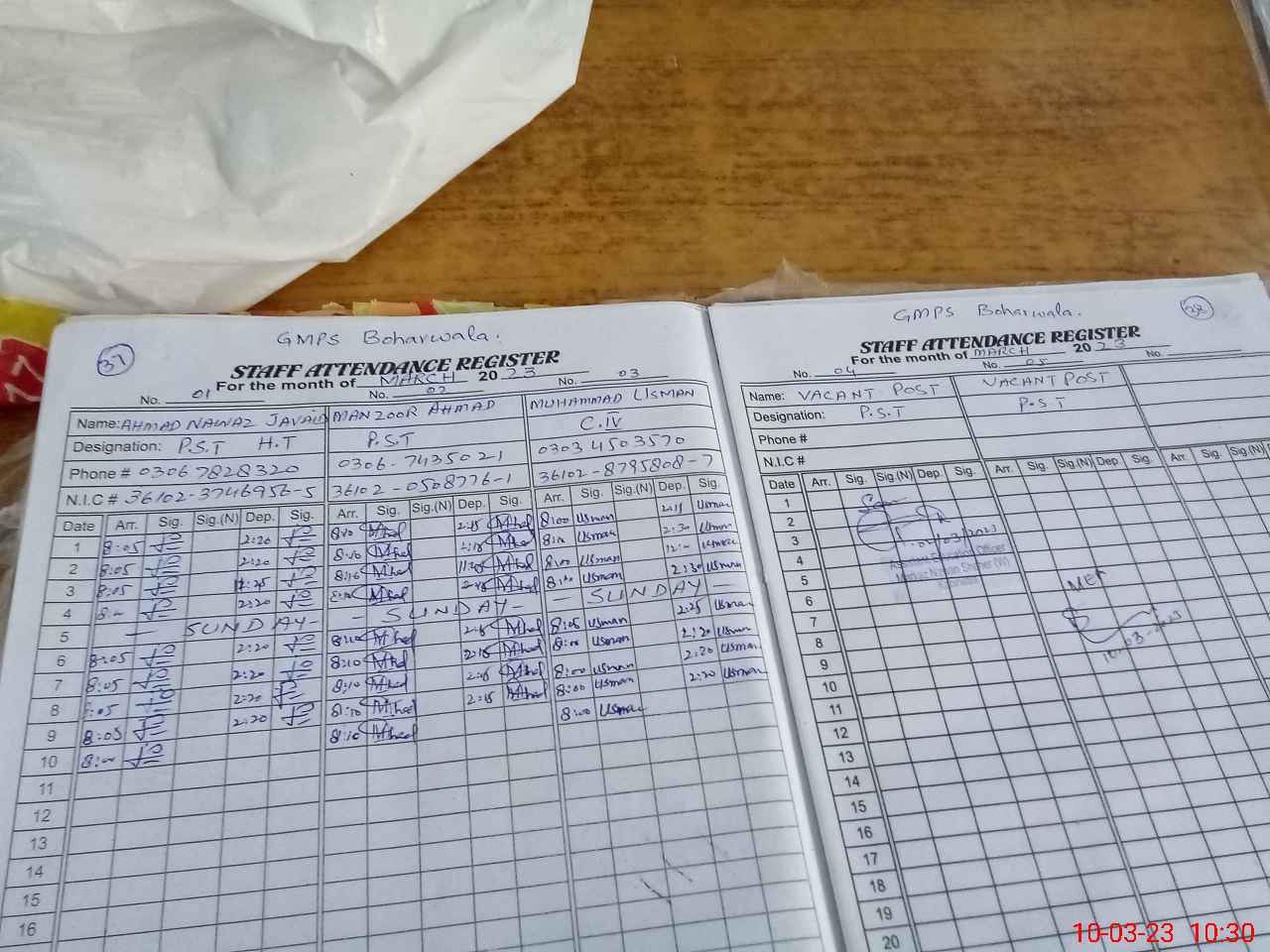 | CNIC | Full Name | Designation | R/C | Absence During Last Calender Month |