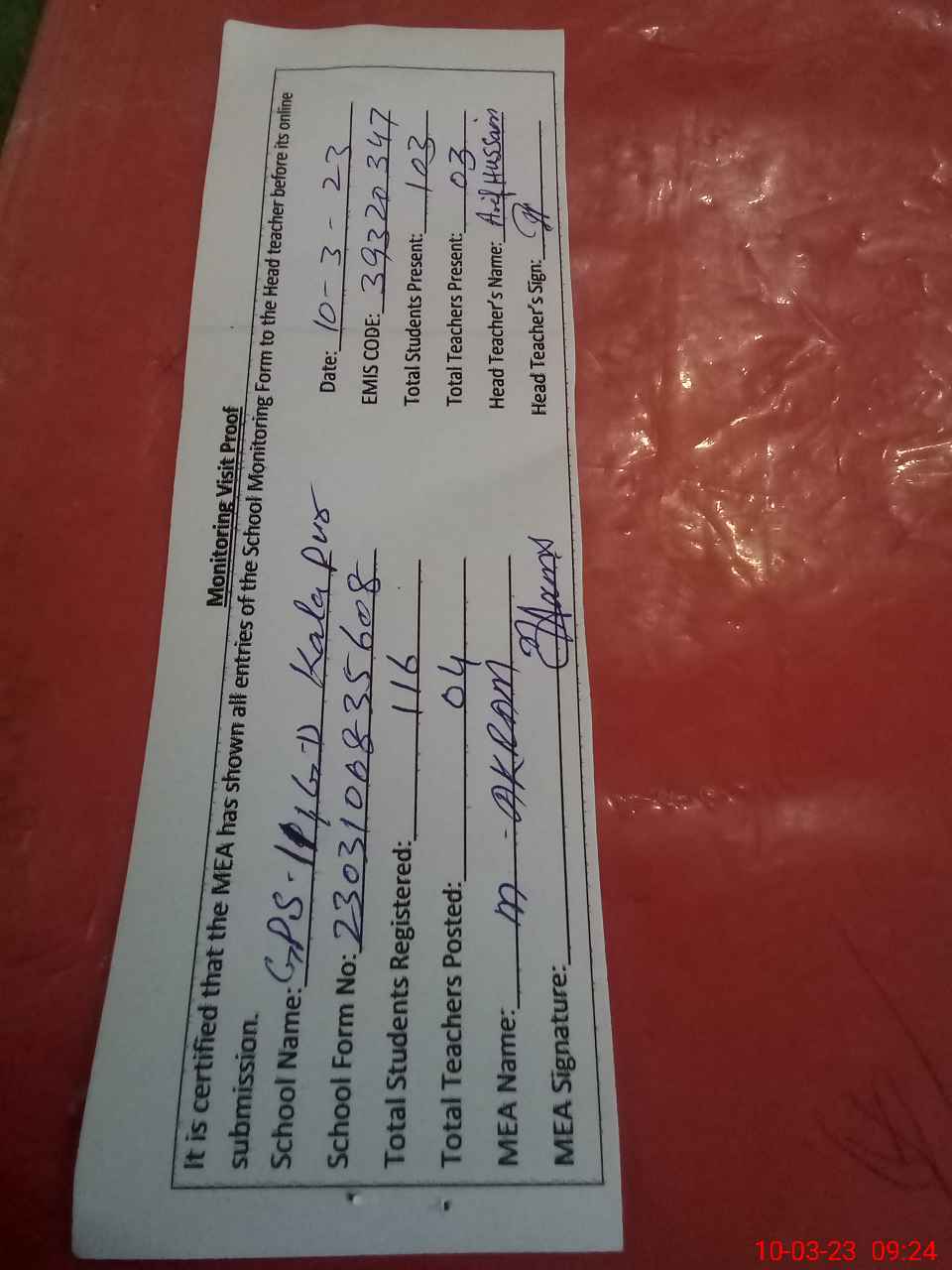 | Attendance Register | Head Teacher | MEA with School | Visit Proof |