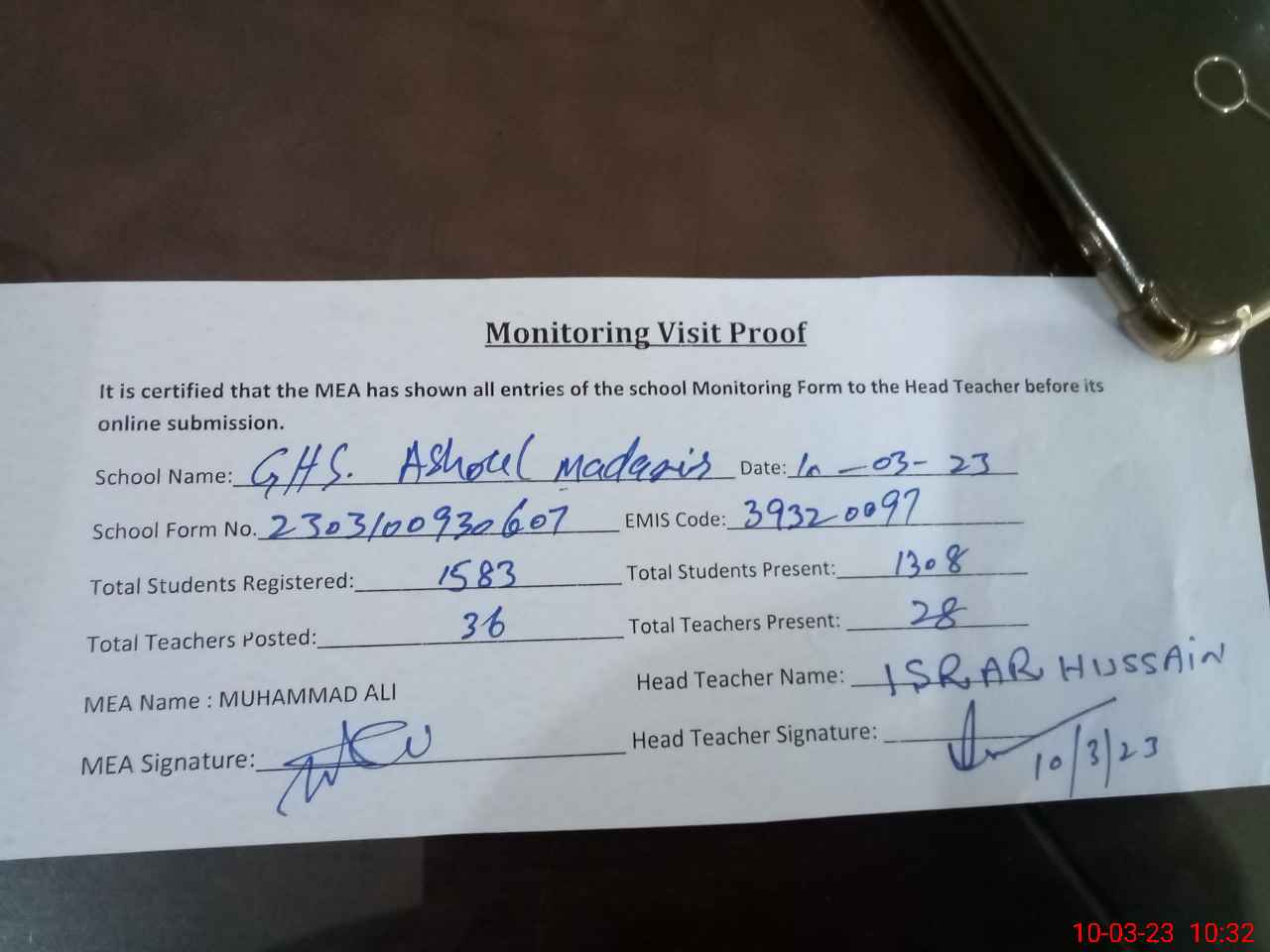 | Attendance Register | Head Teacher | MEA with School | Visit Proof |