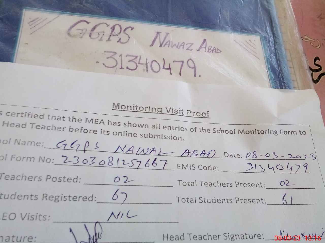 | Attendance Register | Head Teacher | MEA with School | Visit Proof |