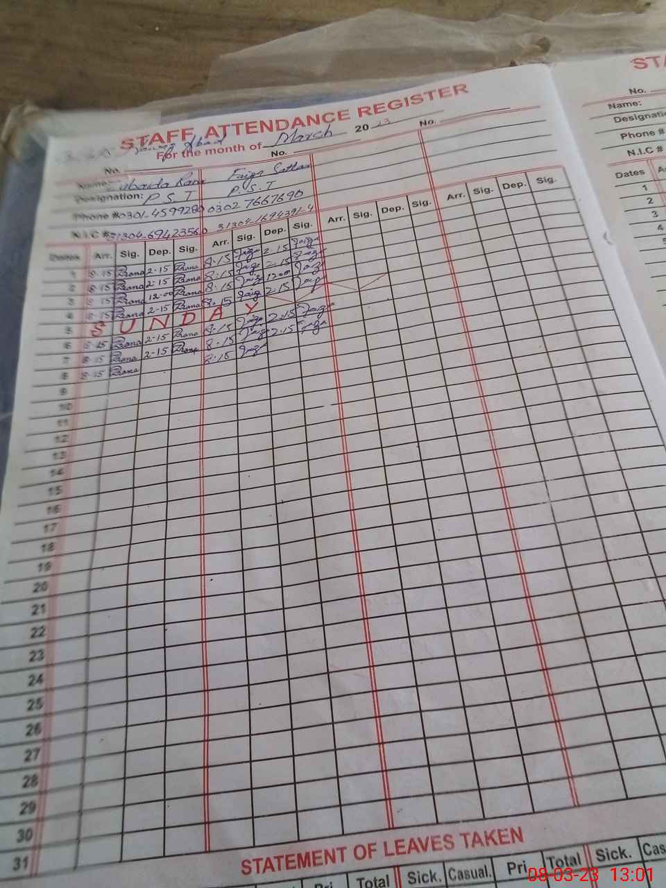 | CNIC | Full Name | Designation | R/C | Absence During Last Calender Month |