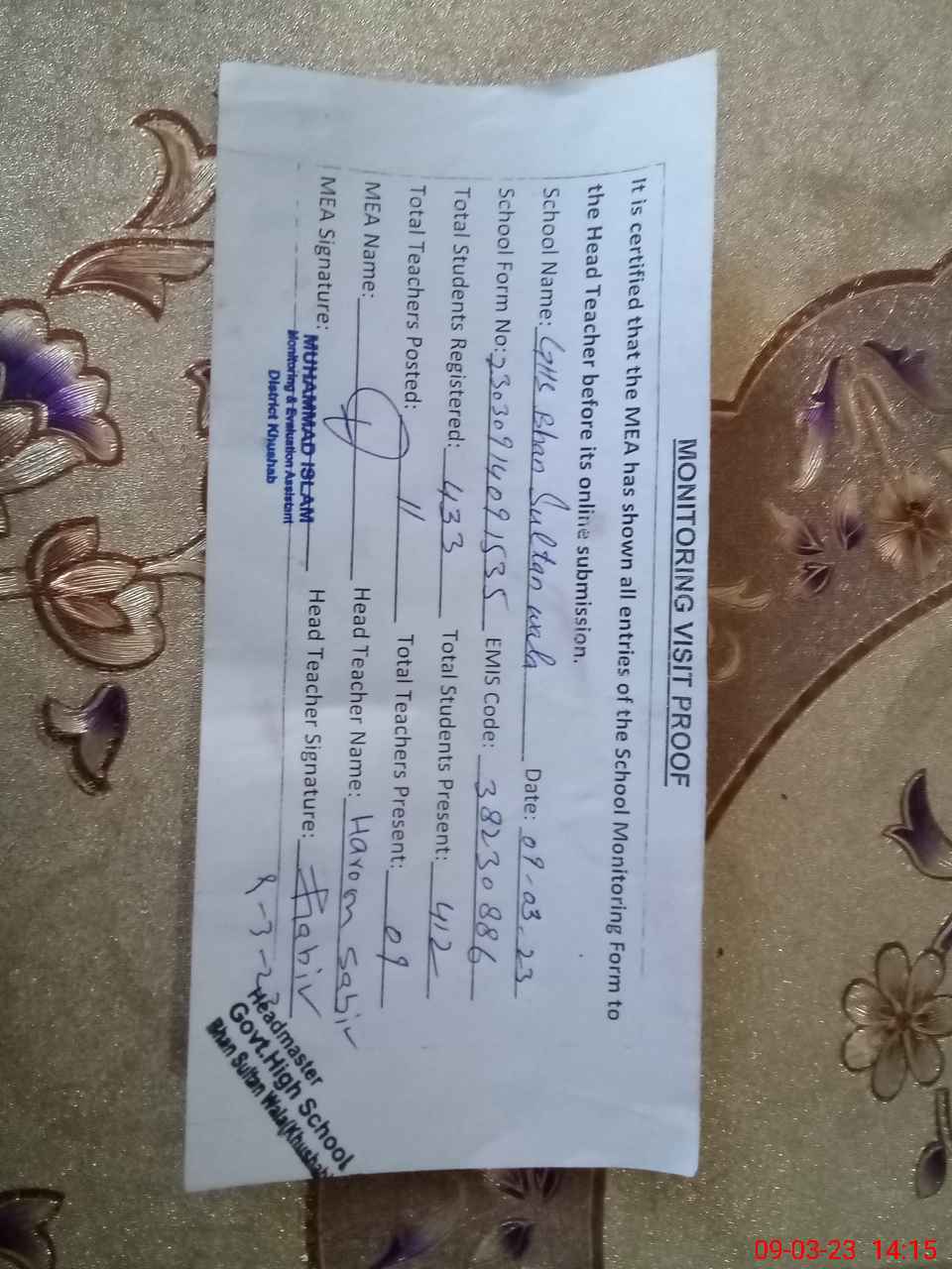 | EMIS Code: 38230886 | Name of School: GHS BHAN SULTAN WALA KHUSHAB | |||