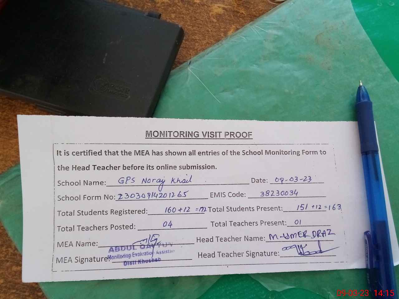 | EMIS Code: 38230034 | Name of School: GPS DERA NOORAY KHAIL SHIMAR | |||