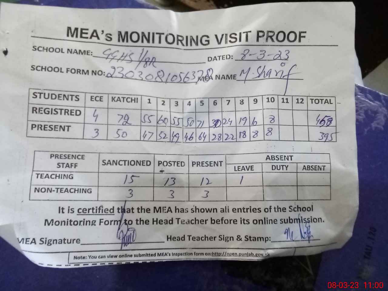 | Attendance Register | Head Teacher | MEA with School | Visit Proof |
