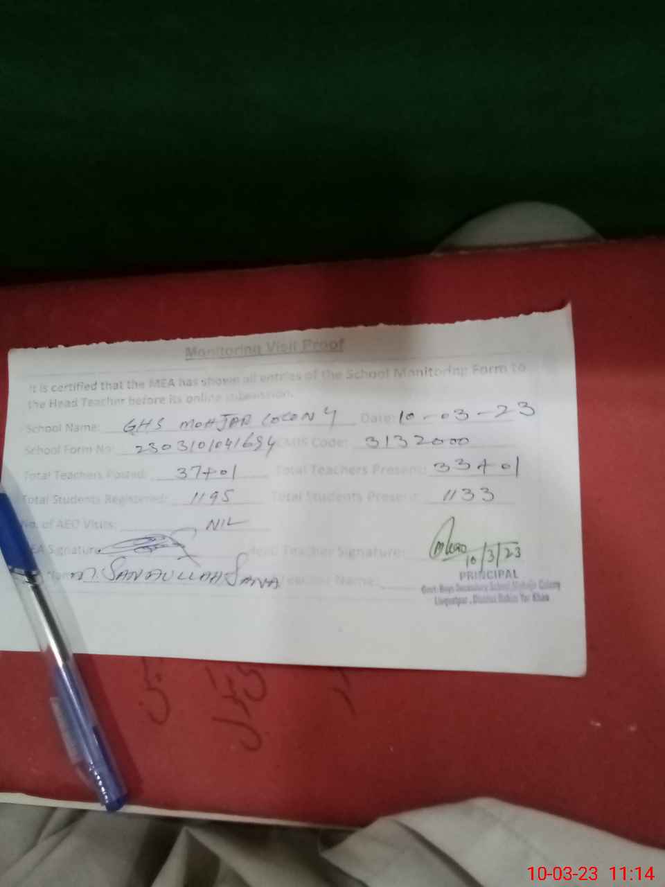 | Monitoring Date: 10-03-2023 | Start Time: 10-03-2023 10:40 AM | End Time: 10-03-2023 11:16 AM | Name of MEA: Mu**** Sa**** Ul**** Sa**** | |